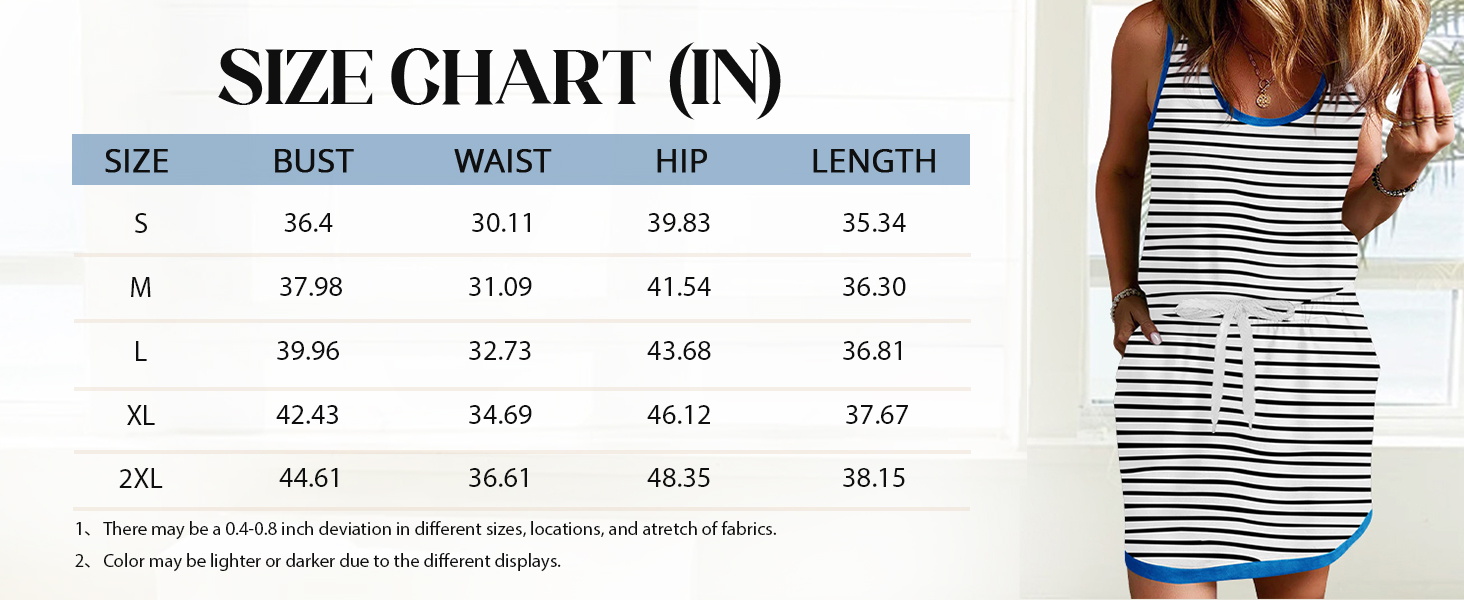 FEATURES: Summer casual sleeveless dress, round neck, above knee length, striped print, cute contrast trim, elastic waist, tie waist, two side pockets. This comfy loose dress is perfect for everyday wear.