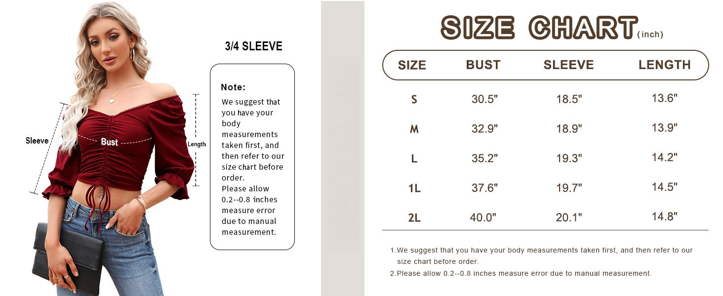Features: Solid color, ruffle trim 3/4 sleeve, cropped length, strapless, soft and comfy fabric, ruched, pull on crop top for women and girls