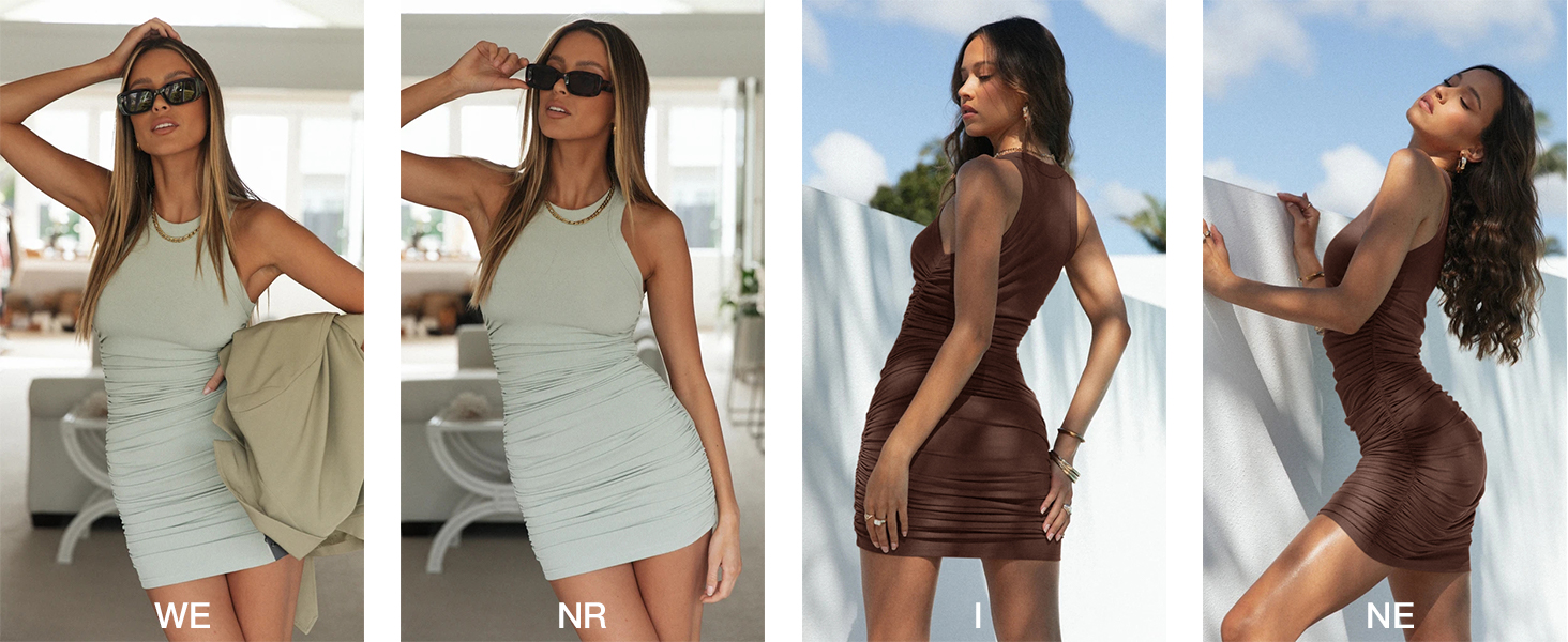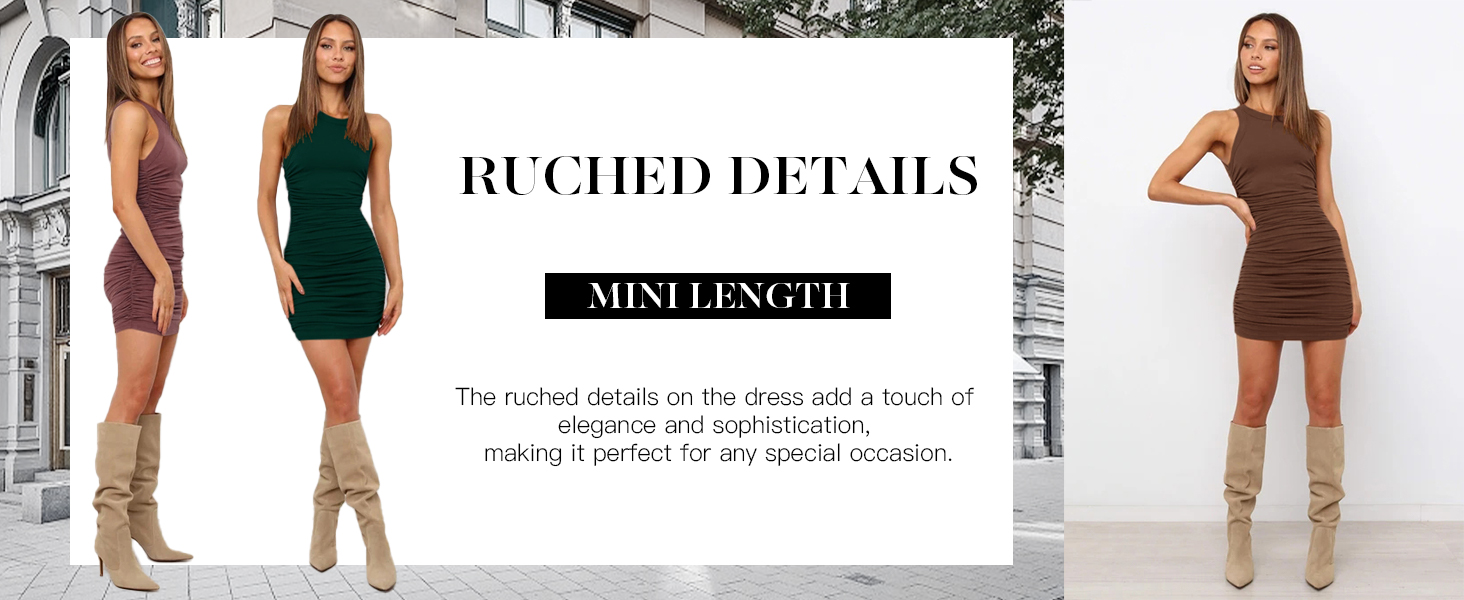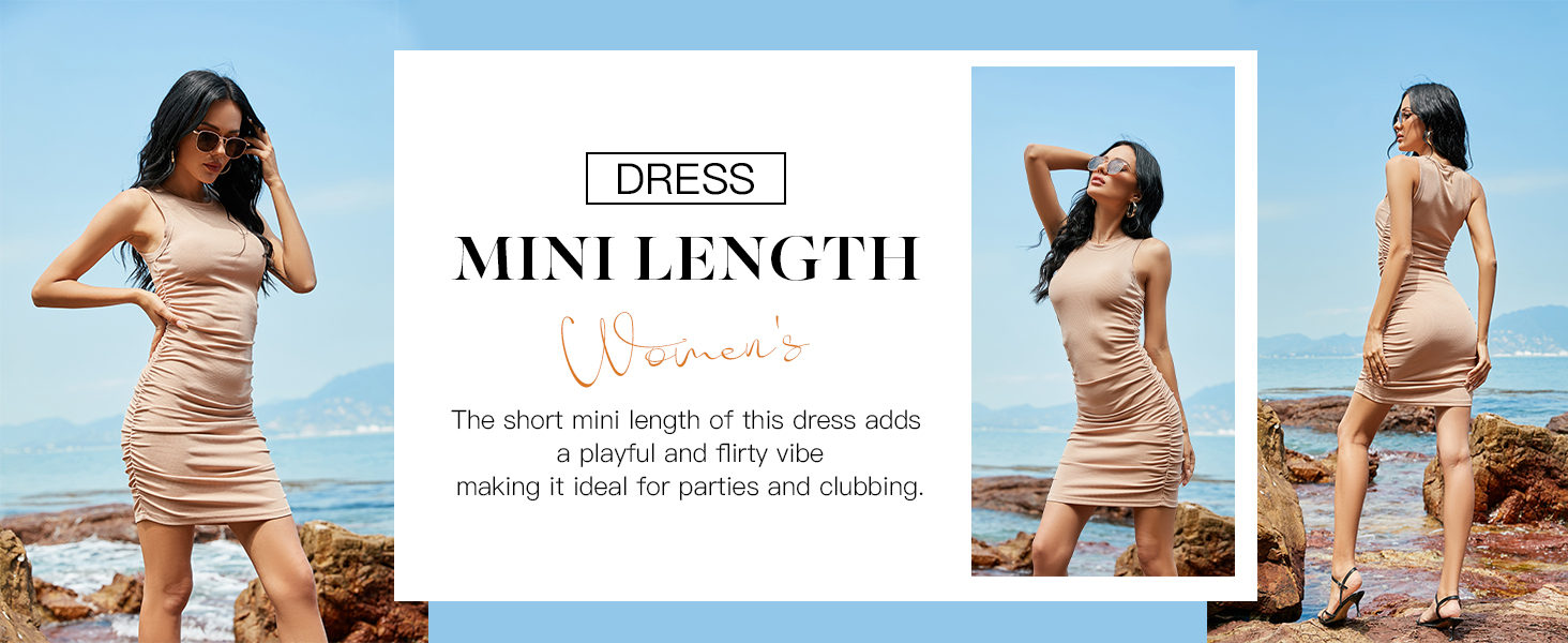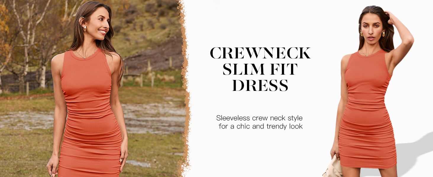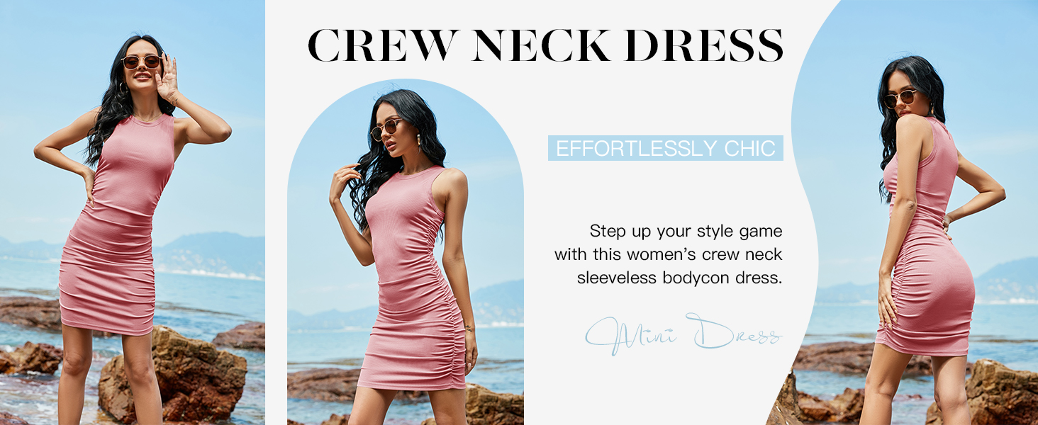 Summer party dress, Ruched stretchy dress, Sleeveless Bodycon Dress, Crewneck slim fit dress, go to club dress, Sexy mini dress, Round neck casual dress.
