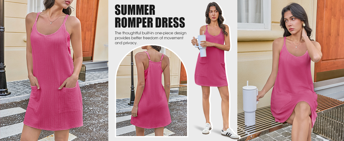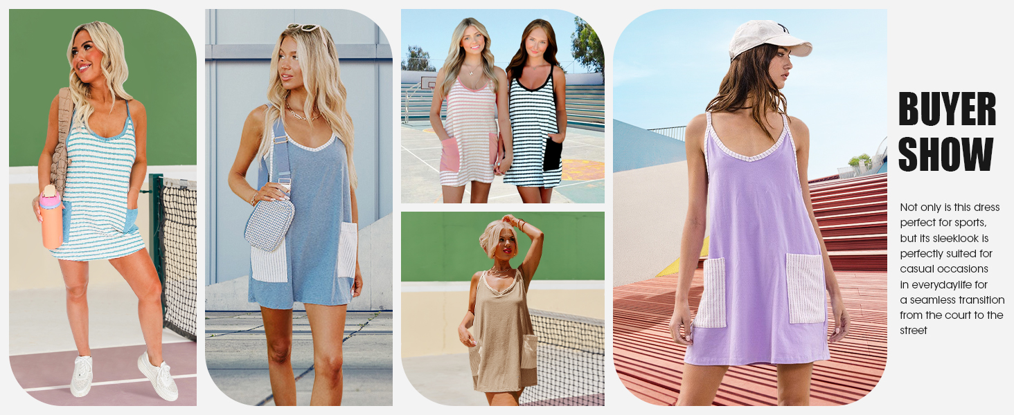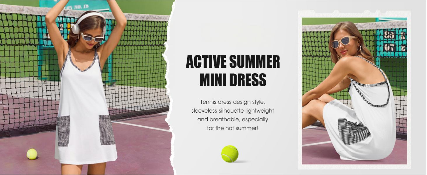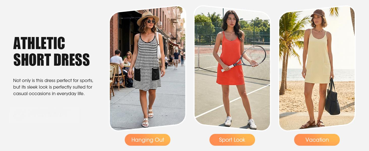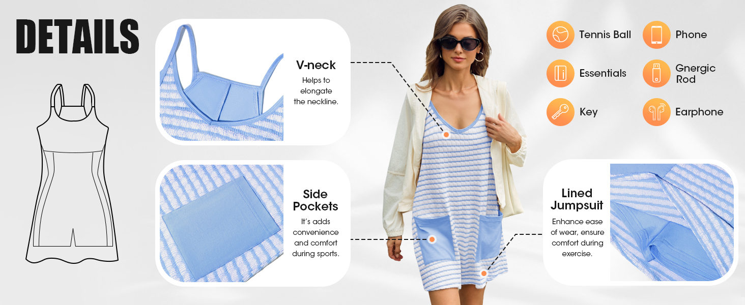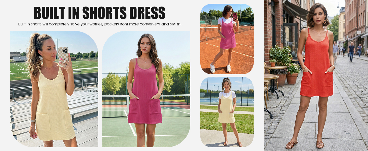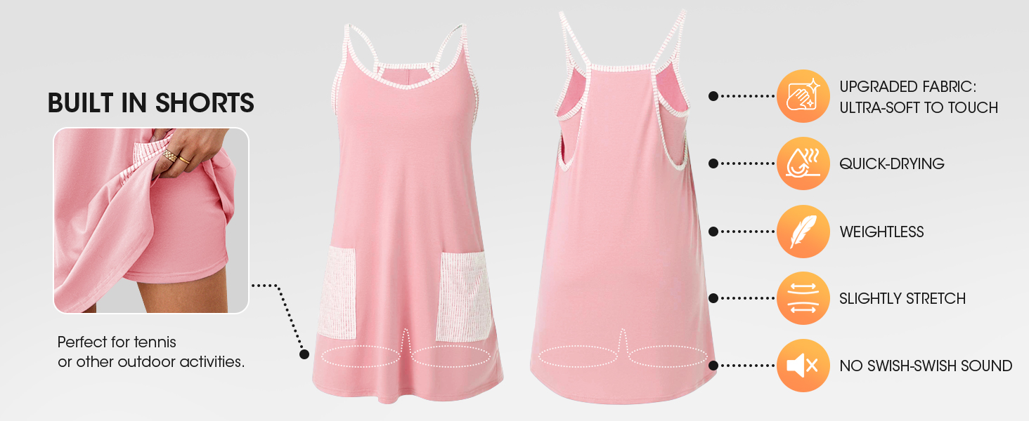 Features: Athletic dress for women with v-neck and strap is cooler for hot summer, built in shorts will completely solve your worries, pockets front more convenient and stylish