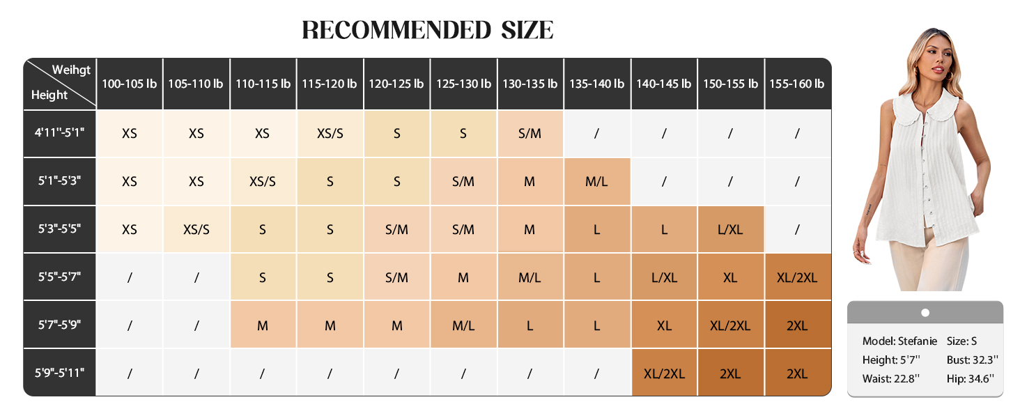 Features: Peter Pan collar with petite ruffles, ribbed button loops, button front, sleeveless, eyelet hem, flowy loose fit. This shirt can be worn in many ways, which can gives you an additional charming look and make you shine in this summer.